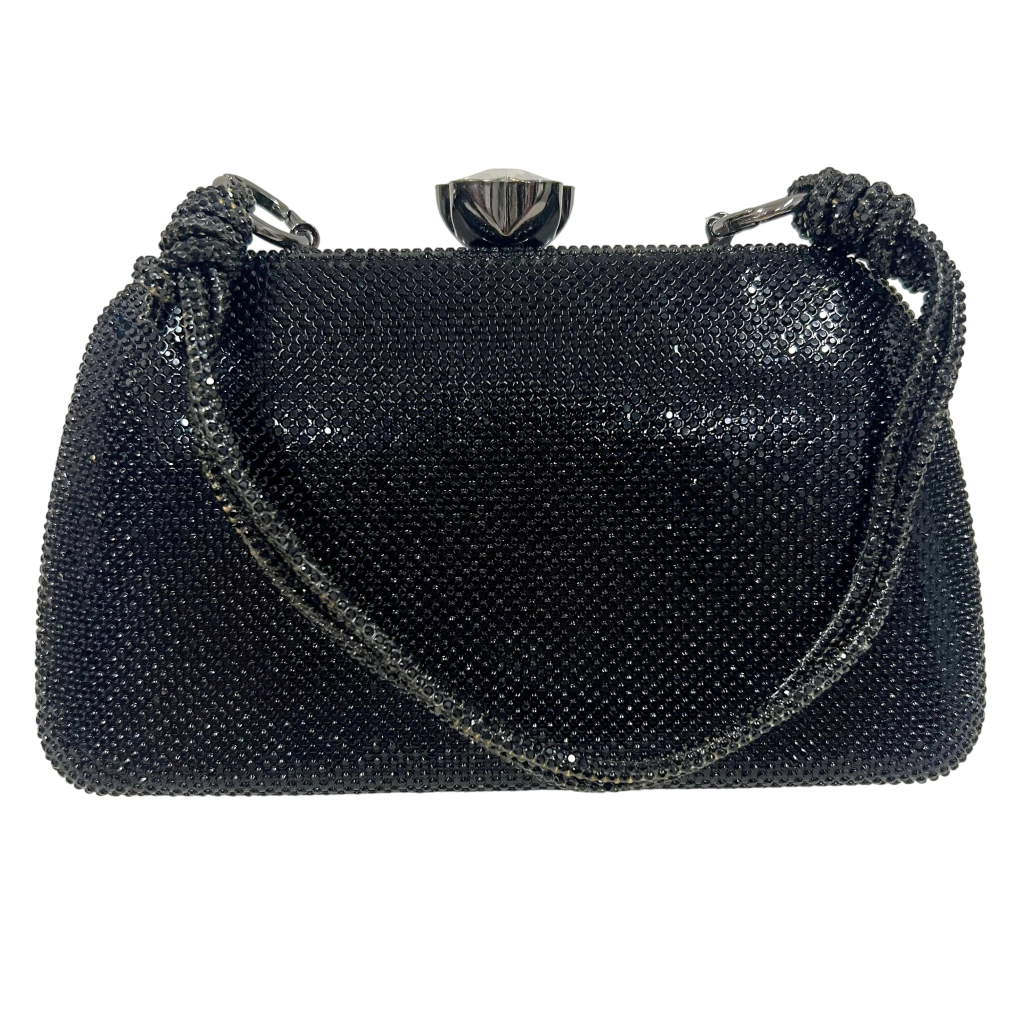 Esta clutch é um verdadeiro encanto, feita com um tecido coberto com strass e forro interno em tecido que garante qualidade e sofisticação. Seu design é complementado por uma charmosa alça de mão, e a alça longa de corrente de metal permite versatilidade, podendo ser usada com ou sem.