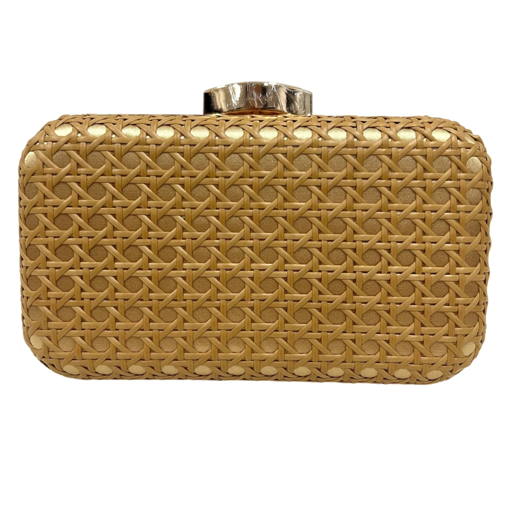 Clutch retangular de palha sintética, fundo em tecido dourado, clutch em cor mais neutra.