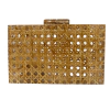 Feita de acrílico com o aplique de palha por dentro do acrílico e com um fecho magnético. Suas dimensões de 18cm x 11,5cm x 5cm