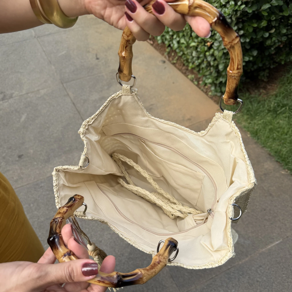 Material ráfia de palha sintética. Alça de acrílico em formato de bambu.