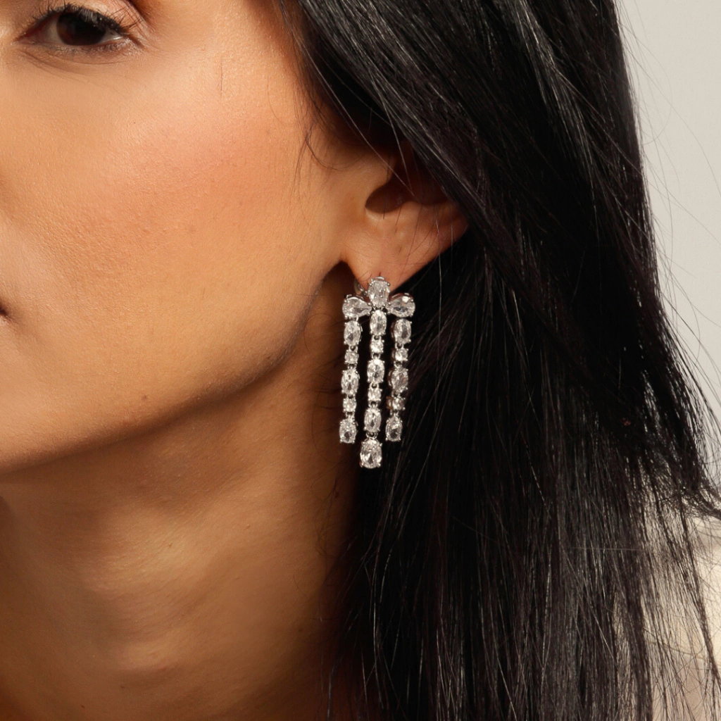 Brinco semijóia de franja com baguetes e pedras ovais.